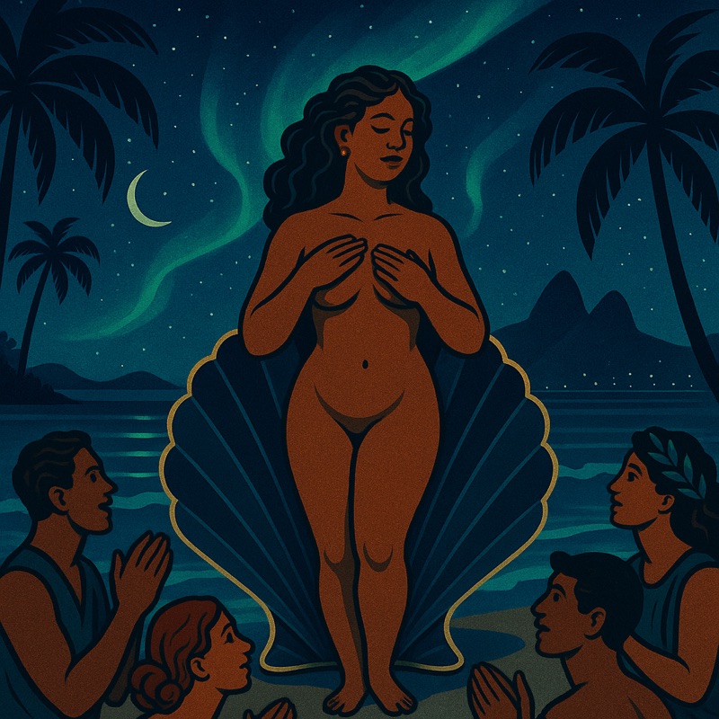 Collaborative digital artwork with AI, inspired by Botticelli’s Birth of Venus.