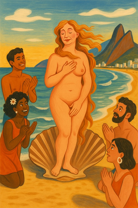 Modern reinterpretation set in Ipanema Beach, Rio de Janeiro, celebrating diversity, joy, and affective freedom.